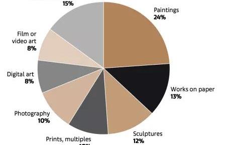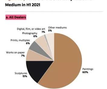 3.3.1市场结构的影响从2020艺术市场的交易额分布可以看出,数字艺术品的交易额仅为六千六百多万美元,占到2020年艺术品交易额的0.6%。这个数据在2021年上半年产生了巨大的变化,交易额达到13亿美元,同比增加了747%。大多数经销商和收藏家对NFT艺术的积极态度,对NFT艺术产生了非常积极的影响。据2021年上半年的数据统计,当前藏家所拥有的作品中,有16%为数字艺术作品、影像和视频艺术作品,数字艺术的购买占藏家支出中位数的12%,虽然主流艺术形式仍然占藏家的一大部分,但有接近一半的受访藏家表示他们在未来12个月内有兴趣购藏数字艺术品。说明数字艺术在得到版权认可以后,逐渐成为藏家的收藏的重要种类。