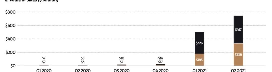 NFT艺术品使得艺术市场机制也发生了显著变化。从今年初佳士得以6930万美元的高价价格拍出艺术作品《每一天:前5000天》之后,市场对NFT艺术的关注程度大幅提高,随后,各大拍卖行陆续拍出NFT艺术作品。例如:著名街头艺术家班克斯的作品《Mornos》,该作品的创作者将作品的原作毁掉,并将其电子版本生成NFT,最终该NFT作品在OpenSea以约合人民币247万元的高价被卖出,超出了原作购买价格的3倍。8月,佳士得举办了首次设计NFT拍卖,推出美国设计师米莎·卡恩10个色彩缤纷的NFT设计系列,这些设计的生物形态被想象成功能性家具。9月,全球首家NFT实体画廊“创世艺术画廊”在香港K11Musea正式开幕,同时还呈现了首次以教育为目的的多元化NFT艺术主题展。可见,NFT艺术通过各种渠道逐渐进入大众的视野,成为新兴艺术市场的热点以及收藏市场追捧的对象。根据以太坊网络上所有NFT的销售数据统计,2021年区块链上的销售额和数量均大幅增加。销售额从2020年上半年的1740万美元增长到2021年同期的近13亿美元,到2021年第二季度末,NFT艺术市场的买家数量和卖家数量分别达到53,198人和18,429人。从数据图可以看出,收藏品类与艺术品类几乎各占领NFT市场半壁江山,而游戏、体育、元宇宙类等NFT品类也在慢慢崛起。目前NFT市场虽交易额及单价相对较小,但艺术家、艺术品和收藏家人数活跃比例却极大超过传统艺术市场。