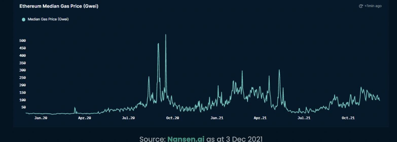 拓展性问题是限制许多区块链网络增长和其使用的关键。在以太坊网络上,拥堵导致的过高的气费让许多开发商迁移到其他L1链和L2上。当完成一项简单交易的成本高于所转让资产的价值时,高昂的gas费将令人望而却步。高昂的gas费使零售参与者开支很大开启蚕食商业模式。大型代币持有者和机器人正为零售业定价,迫使他们承担高昂的汽油成本,面临基层障碍。这限制了网络的发展,也因此阻止了更广阔加密空间的创新。下表反映了过去两年中不断上升的Gas价格,该图可在Nansen上随时查看。以太坊gas价格中值