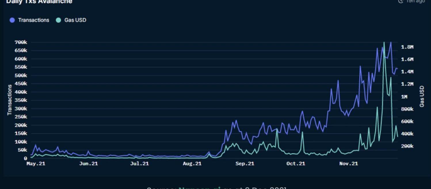 下图突出显示了过去六个月中,Avalanche网络上的日常交易是如何稳步增长的。这一趋势反映了加入生态系统的项目数量不断增加,范围从DeFiprimitives到NFTs和企业采用。Avalanche日交易量