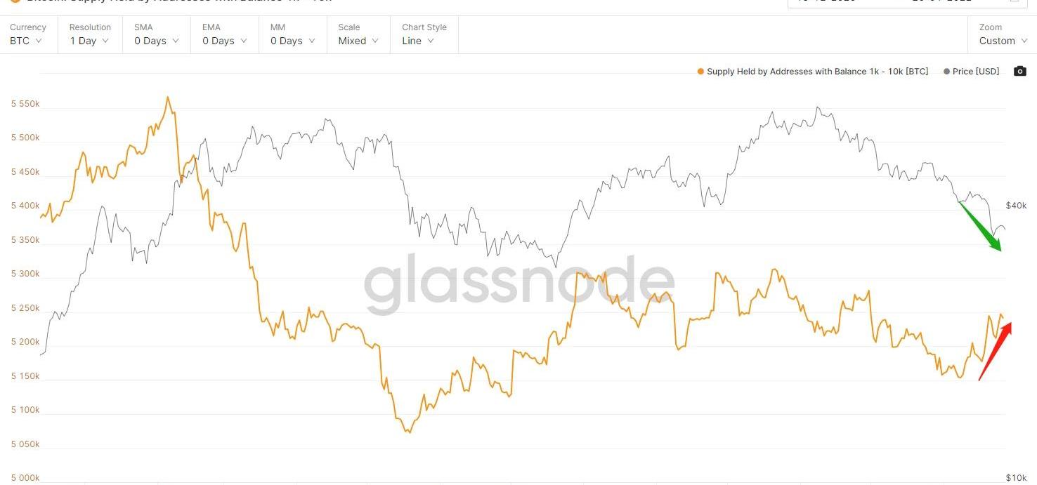 价格下跌,1K-10K鲸鱼持仓在增加,说明主力在缓慢的吸筹中。