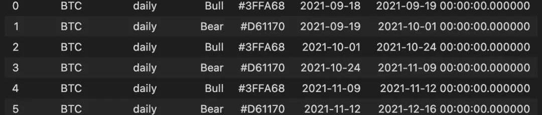 复杂的加密货币蜡烛图,包括性能指标和市场趋势这个图表使用了Plotly中的两个y轴。右边的y轴是用来绘制蜡烛图的。左边的y轴用于绘制MACD和MACD信号线。每当MACD线越过MACD信号线上方时,我们就进入一个牛市周期,这个周期用绿色方框表示。每当MACD线跌破MACD信号线,我们就进入熊市周期。后一种情况用一个红框表示。小结