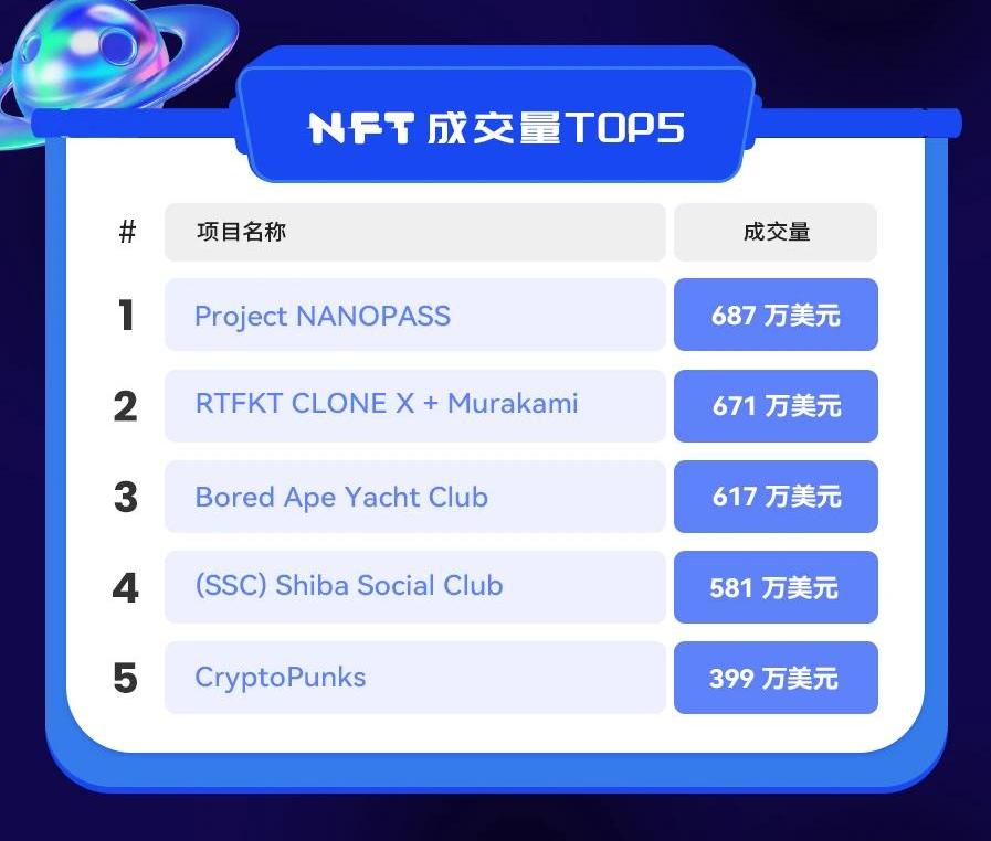 按过去24小时成交量,排名前五的项目分别为ProjectNANOPASS、RTFKTCLONEX+Murakami、BoredApeYachtClub、(SSC)ShibaSocialClub和CryptoPunks。