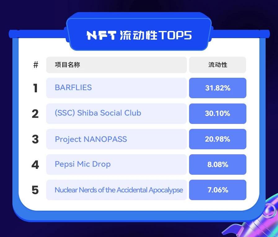 按过去24小时流动性指标,排名前五的项目分别为BARFLIES、(SSC)ShibaSocialClub、ProjectNANOPASS、PepsiMicDrop和NuclearNerdsoftheAccidentalApocalypse。