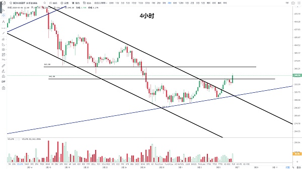 盘面走势,BCH在突破前期触顶498美元回落的下降通道后,这两天迎来持续反弹,价格沿5日线稳步上行,4小时走势近期构筑了一个双底结构,目前价格已突破343美元颈线压制,量能配合继续向上的概率大,日线指标线即将金叉,其余指标也都保持向上,不在跌破颈线,短线有望保持强势,沿5日线持有,压力365美元。