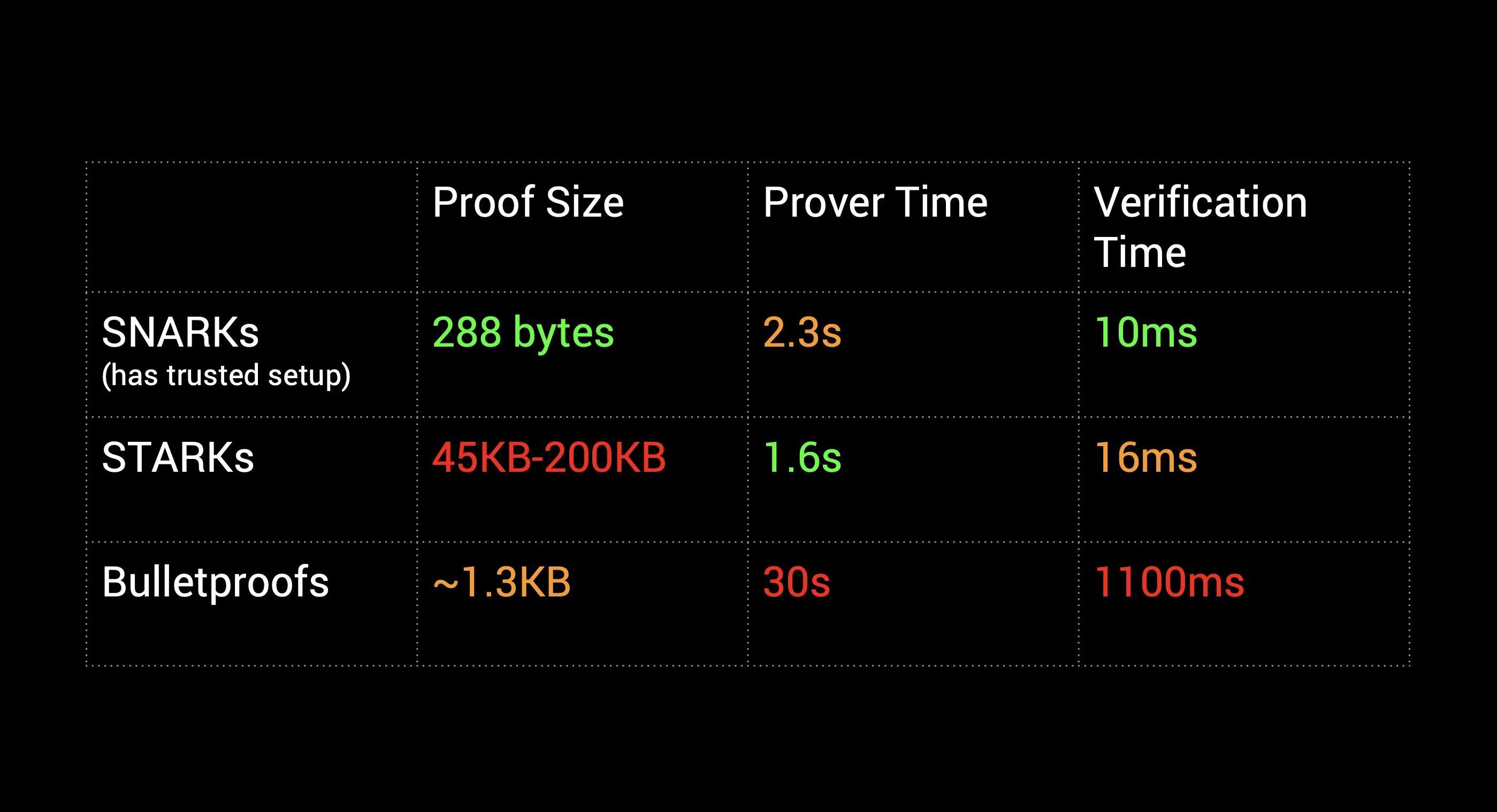 ZK证明中主要有SNARK,STARK,Bulletproof三种.Bulletproofs和STARK不需要可信设置,STARK使用公开可验证的随机性来创建不受信任的可验证计算系统.其中STARK相较于其他两种,证明大小大非常多,但在计算时的大小和证明速度上有很大优势.同时STARK的安全性更高,可以抗量子攻击.