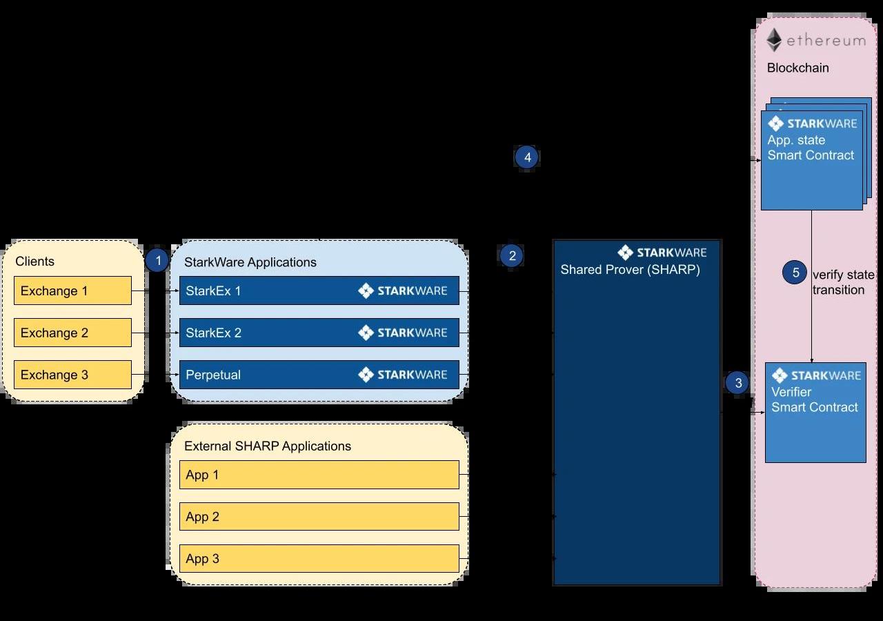 上图是一个使用了StarkNet和StarkEx的典型应用的架构图.假设这个应用是一个叫Starkswap的DEX.最左侧黄色框内的应用——操作整个应用这个链下组件接收用户交易并定义业务逻辑和执行顺序.它将交易传递给StarkEx服务.这个组件是应用的中心化前端,通常为Web或客户端.淡蓝色框内的StarkEx服务——批处理和协调一个链下组件,负责批处理一组操作并根据操作更新系统状态.对于每个批次,它会将这批操作(通过Cairo语言执行,先把Solidity的字节码转化成Cairo语言的智能合约,在到Cairo语言环境中运行)发送到SHARP以证明其有效性.一旦证明得到验证,它就会在链上发布新的状态.状态由默克尔树表示.每个Vault的结构和内容根据实现的特定业务逻辑而有所不同.默克尔树根代表要提交到链上的状态.SHARP——共享证明器(由StarkWare专门为应用定制)SHARP是Cairo语言的共享证明服务.它接收来自不同应用程序的证明请求并输出证明以证明Cairo代码执行的有效性.输出证明可以在多个证明请求之间共享.这个组件此前的名字叫GenericProverService.所以组件本质上是一个后端服务器,包含了一些特定服务.推测是部署在StarkWare的中心化服务器上.StarkEx合约(Verifier合约)——状态更新、存款和取款该合约有两个主要功能.第一个功能是在验证满足有效性条件后更新系统的状态,第二个功能是以非托管方式管理进出StarkEx的存款和取款(任何情况下,用户都可以提取他们的资金).这个组件是以太坊上的一个智能合约.Starkswap的业务逻辑如下:处理请求\n淡蓝色方框内的StarkWare应用程序处理客户请求,将这些交易转换为可证明的陈述,并将这些发送给深蓝色方框内的SHARP.所有请求发送与处理都通过图中第一步的API以及第二步中的批处理语句发送(一个批次可以编译多个请求).SHARP证明\n深蓝色的SHARP构造证明.登记证明\nSHARP将证明传输到粉色框中的第三步的链上验证者智能合约.注册状态转换\n第四步中,StarkWare应用程序在Starkswap智能合约上进行应用状态转换.\n第五步中,为确保转换的有效性(SHARP的验证),Starkswap的智能合约确认转换语句已在Verifier智能合约中注册.功能与加密算法