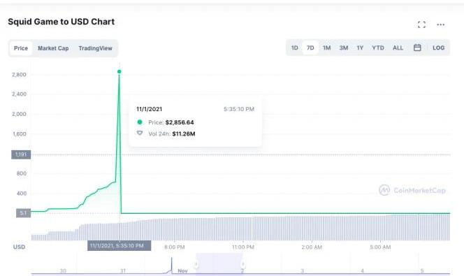 美国流媒体巨头Netflix出品的《鱿鱼游戏》成为时下现象级爆款影视剧,该剧描述了456名韩国社会的边缘人,在走投无路之际被神秘组织以巨额奖金为诱饵走进了「大逃杀」密室,在经过「一二三木头人」、「抠糖饼」、「拔河」、「鱿鱼游戏」等一系列游戏后,最终只能有1个人能活着获得456亿韩元的终极奖励,而代价则是其余455人命丧游戏中。在《鱿鱼游戏》热播并积累了大量的受众时,区块链应用开发者瞄上了这个流行IP。10月26日,与网剧同名的SquidGame「链游」登陆BSC链,这个区块链游戏的设计机制取材于《鱿鱼游戏》中的残酷剧情,玩家想要参与游戏并获得最终的奖金,需要经过6轮比赛,而进入每一轮游戏都需要购买「鱿鱼币」SQUID作为入场费,代币消耗从第一轮的456枚不断增加,在第六场比赛中,入场费将提升至15000枚SQUID。最初SQUID以0.01美元的价格在BSC链上的DEX应用PancakeSwap上发行。借助《鱿鱼游戏》这一热门IP,玩家们接踵而至。为了参加游戏,参与者不得不购买SQUID币,其价格也随之疯涨。最疯狂的时刻发生在11月1日,SQUID在当天凌晨飙升3800倍至38美元,这让它吸引了更多人的注意。而后的几个小时里,SQUID持续暴涨,直至涨到2861.8美元。然而,由于开发者设计了「反倾销机制」,参与游戏的获利者发现,他们根本无法将手中的代币变现,巨大的涨幅看得见、摸不着。不幸的一幕很快发生,在达到高点仅5分钟后,SQUID闪电暴跌至0.0007926美元,相比高点闪崩99.99%,这场「鱿鱼游戏」最终全军覆没,活下来的只有卷款跑路的游戏设计者,参与者无一人幸存。