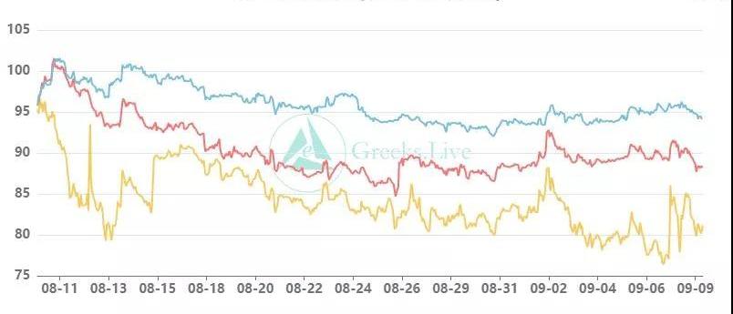 以太坊期权持仓量137万张,价值48亿美元,成交量10万张。10d115%30d91%90d94%1Y109%各标准化期限IV:今日:1m101%,3m107%,6m110%,DVol107%9/8:1m102%,3m109%,6m112%,DVol109%以太坊跌幅没有比特币那么猛烈,前天22点暴跌后就一直在3450美元附近横盘,价格仍明显高于上个月。市场偏好在向看跌期权移动,平值IV变化不大,虚值看涨价格在下降,中短期Skew已经正偏。在期权市场的数据上看,市场对反弹期待不大。