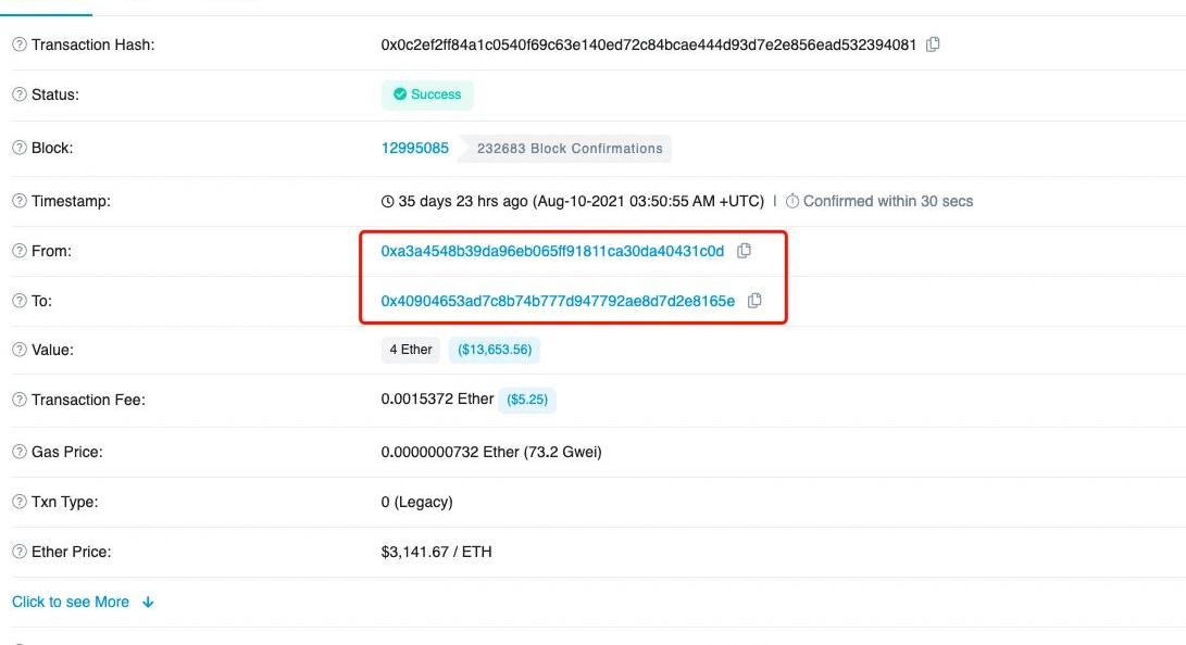 MCM0NEY分享的部分案例流程以第一笔案例为例,该案件涉及的NFT作品为「lurklovesyou」,从链上交易记录来看,Nate先是于8月10日从主地址向“小号”转移了4ETH。