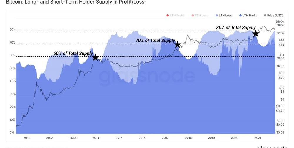 图6每一个周期,长期持有者可以多获得大约10%的供应在每一个长期持有者供应的周期性扩张期间,在牛市后期和熊市早期买入的代币大多是亏损的。这一群体最终会达到“持有峰值”,在等待价格上涨、让自己的代币盈利的过程中,他们的相对供应量趋于平缓。这可以通过下图中从浅蓝色到深蓝色的变化来体现。通常情况下,当价格上升到历史高点时,牛市就开始了,供应紧缩就开始了。