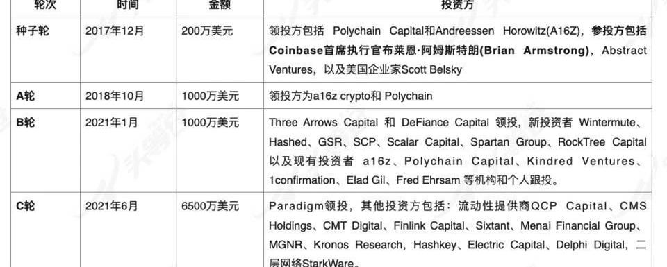团队dYdX自从成立以来就获得大量著名资本的资金和支持,源于其团队很大程度上是Coinbase等知名企业前员工创业的背景。根据领英显示,目前dYdX团队有至少23人,其中8人为软件工程师。AntonioJuliano,dYdX创始人,2015年毕业于普林斯顿大学,专业是计算机,学位是理学学士,毕业前实习在MongoDB,毕业后首份工作是Coinbase的软件工程师,工作一年后进入Uber继续从事软件工程师工作,2017年创立一个叫Weipoint的去中心化网络中的搜索组件,2017年8创立dYdX。BrendanChou,软件工程师兼设计师,创始人在普林斯顿的同学,2015年毕业于普林斯顿,理学学士,专业计算机,第一份工作是彭博社的软件工程师,后在谷歌担任过工程师,2018年初加入dYdX至今。AchalSrinivasan,产品设计师,2020年毕业于莱斯大学,专业是计算机,曾在Coinbase实习,后从事了几年自由职业,2020年加入dYdX。VijayChetty,业务发展主管,毕业于普林斯顿大学,经济学专业,从2010-2015年先后在汉能集团和黑石投资做分析师和投资助理,2015年-2018年在Ripple从事商业拓展/企业合作类工作,2020年加入dYdX。dYdX创始人具备软件开发经验和区块链行业工作经历,以及创办去中心化项目的经历;dYdX项目的开发力量较强,能够支撑其作为一个技术型项目的发展。尽管未看到足够运营方面团队成员的资料,但从过去的表现来看,dYdX在运营上表现不错。dYdX的团队构成能够支撑其项目发展。资金公开资料显示,dYdX至少进行了四轮融资。