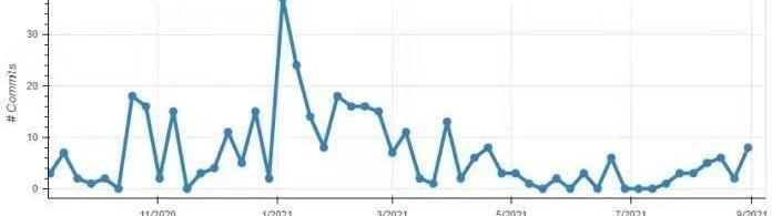 图2-1dYdX自2017年5月至2021年8月底的代码提交量代码提交高峰期为2018年中、2019年中和2021年初,而两轮新产品上线时间分别为2019年7月与2021年2月,代码提交情况与新产品上线情况基本相符。注意,在8月初项目方宣布产品正式上线、交易挖矿开始的时间点,从代码和体验上看,都没有实际更换新产品,而是延续使用2月份原有的产品。
