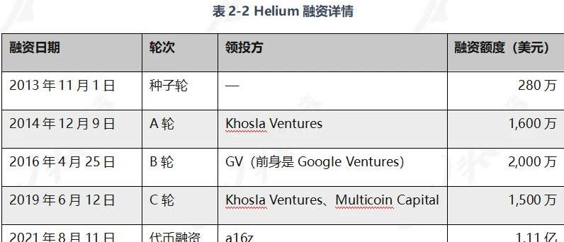 整体来看,Helium团队配置较为合理,并且从2013年就开始进行Helium的产品设计,与当前项目的契合度较高。2.2资金