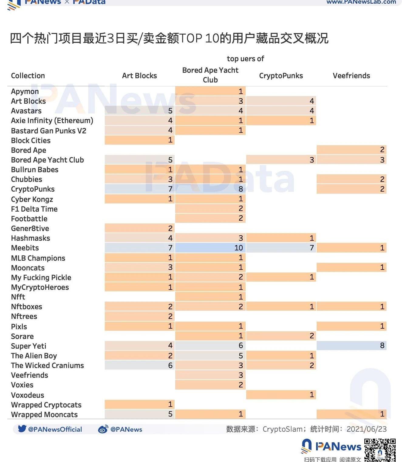 但这是整体情况,NFT的交易实际具有很强的个体特殊性,即使在最可能获得较高转手收益的第2次换手交易中,也不存在不少投资者因转卖而发生亏损的情况。比如BoredApe#:2239,受到ETH币价波动影响,第2次换手交易的美元本位价格较初次交易降低了2.24%,也即转卖者0xbe...c95e亏损了2.24%。再如CryptoPunk9023,0xf3...bd1f在转卖时降价48.23%成交,也即亏损48.23%。不过这并不是亏损最多,多个NFT在第2次转卖中的亏损率都超过50%,比如0x76...382b在第2次转卖QuickQuail时亏损了68.02%、0xf5...21ed在第2次转卖CryptoPunk6807时亏损了56.34%。从AxieInifinty、BoredApeYachtClub、CryptoPunks和Veefriends这四个热门项目最近3日买/卖金额前10的用户的藏品来看,其中存在不少交叉,这对理解NFT的资金动向和发展趋势有一定帮助。