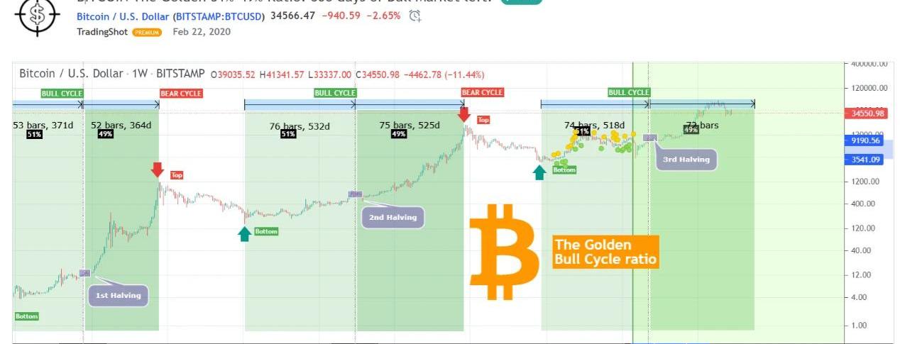 这一指标研究的重点是牛市周期。该指标显示,前面几轮牛市都有一个共同点:从底部到减半阶段占整个牛市周期的51%,而其余阶段(从减半到顶部)占49%。