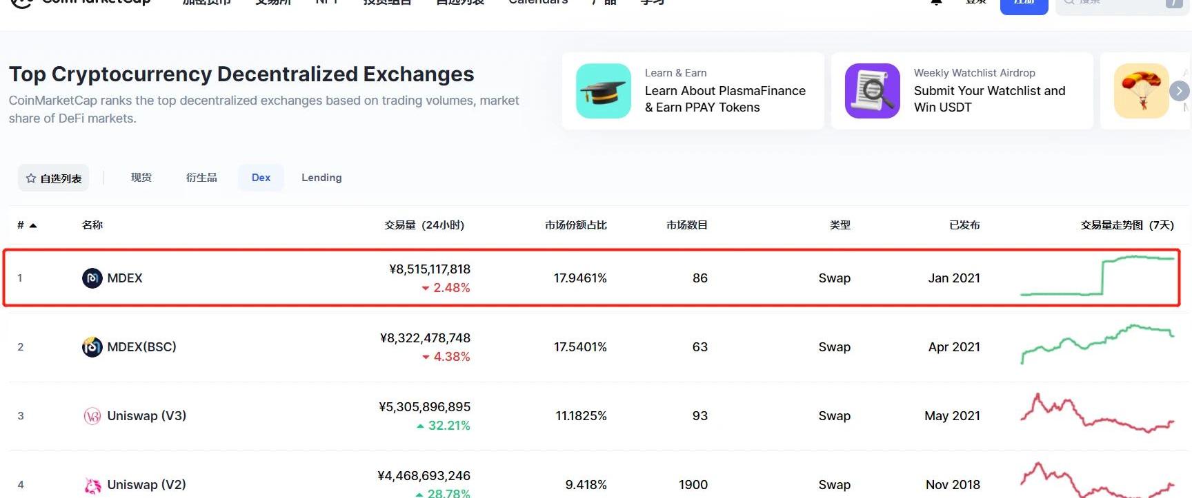 刚刚过去的5月,对加密资产圈的朋友们来说,可谓惊心动魄。5月19日行情暴跌、5月21日国务院金融委称打击比特币挖矿和交易、以及内蒙古发布打击比特币挖矿的八大细则等,都给行业带来巨大震荡。在大量投资者爆仓亏损、部分交易平台关停合约业务,国内矿业服务商出海等热点话题之外,5月份交易所排名和数据的变化,也引起了我们的关注。在这样的特殊背景下,各交易所也意外迎来了对自身综合能力的一次“抽查考试”。首先看去中心化交易所,MDEX依托火币的HECO生态链大力支持,并凭借月底举行的IMO活动带来的巨大流量效应,一举超过UniswapV3,位列DEX赛道榜首。据CoinMarketCap数据,截止到6月4日下午4时,MDEX24小时交易量达85.15亿元人民币,市场份额占比超过17.9%,较UniswapV3领先近6.8%。