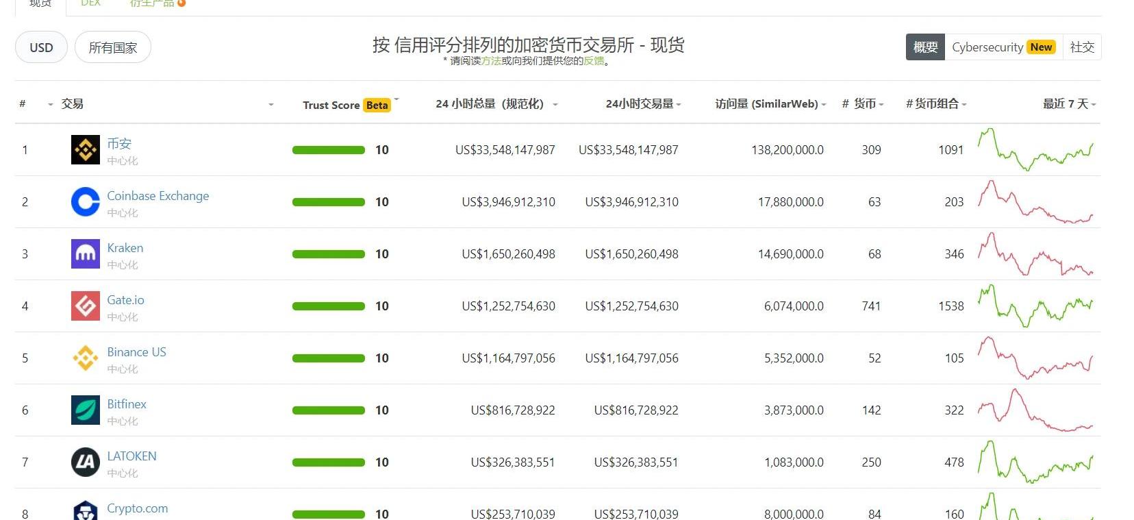 MDEX在CoinMarketCap上排名第一而在中心化交易所中,币安和Coinbase在大部分时间里稳居前两位,二者交易量也呈现出上升趋势。据CoinDesk消息,币安在5月份的交易量达到2.46万亿美元,比4月份增长了49%。另外,Coinbase在今年5月促成了738959.42枚比特币的交易,按当前市场价格计算价值约59亿美元。这是该交易所自2018年3月以来的最高比特币交易量。究其原因,在牛市背景下,大量传统资金的入局或许推高了两大头部交易所的交易数据,并使其呈现出更鲜明的“马太效应”。从差异的角度看,币安5月份的流量效应主要依托更完善的BSC公链生态、BNB价格的持续走高及通缩机制,以及在5月上线了SHIB等热门币种。而Coinbase则通过今年4月份登陆纳斯达克广为更多传统投资者所认可,并在4月底允许美国用户使用PayPal账户购买加密货币,进一步破除横亘在大众与加密货币交易之间的障碍,以此收获大批流量。另外,老板行事高调的FTX在5月同样表现尚可,其日交易量从5月1日的13.35亿美元,增长至5月31日的15.48亿美元,增幅达16%。而部分交易所或受监管影响,交易量出现了明显的下滑。较为明显的是韩国交易所Bithumb,其日交易量从5月1日的19.24亿美元下滑至5月31日的12.05亿美元,跌幅达37%。5月,韩国金融界高层表态,将加强对非法加密货币交易的监控,并对加密货币交易进行征税。另据韩联社消息,业内人士预测,韩国60家左右加密货币交易所中,除了Bithumb、Coinone、Korbit和Upbit四大交易所之外,可能只有Gopax一家能幸存下来。可见韩国政策收紧带来的利空,对本土交易所带来的冲击之大。除此之外,排名变化较为明显的平台有Gate.io。截止到6月4日下午4时,Gate.io在CoinGecko的交易所榜单中位列第四。此外,Gate.io的信用评分分数一直保持满分10分,是全球仅有的7所满分交易所之一。显然,交易量的增加,直接带动了Gate.io排名的提升。这一系列变化,源于5.19暴跌行情开启、部分主流交易所相继“宕机”之际,Gate.io平台系统仍能正常运行,并及时采取应急举措,从而短时吸引了大量“避难”用户。据了解,在5.19暴跌行情下,Gate.io正常处理了40多亿美元的现货+合约交易。同时,Gate.io快速执行“延长增加保证金和还款时间17个小时”决策,为用户争取到及时止损的时间。粗略统计,此举帮助平台用户挽回损失近6000万美元。同时,全网频繁转账导致以太坊gas费用高企堵塞严重,为避免用户在不知情的情况下额外支持过高成本,Gate.io还暂停了ETH和ERC20提现,并通过波场TRC20网络为用户提供USDT快速免费充值和提现通道,节约了用户的时间和资金成本。后随着gas费回落,平台逐步恢复了ETH和ERC20提现。