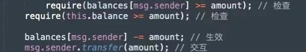 这种方式就是确保状态变量的修改要早于转账操作,即Solidity官方推荐的检查-生效-交互模式(checks-effects-interactions)。