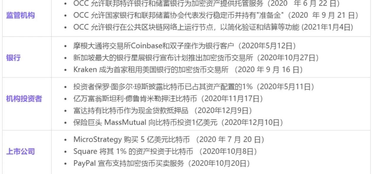 与此同时,由Coinbase联合创始人弗雷德·埃尔萨姆(FredEhrsam)和前红杉资本合伙人马特·黄于2018年创立的Paradigm,最近也已从投资者那里总共筹集了10亿美元。除了不断刷新募资额度的投资基金以密集成立的姿势跑步入局之外,上市公司、监管机构等方面的动作也在明显松动:截至2021年4月28日,美国上市公司MicroStrategy共持有91579枚比特币,其首席执行官MichaelJ.Saylor表示在寻求为股东创造更多价值的过程中,”将继续配置并持有更多的比特币“;PayPal最近发布了Q1财报,营收超60亿美元,部分收入来自加密货币业务。CEO表示未来一半的用户希望可以使用加密货币,而且加密货币用户的APP打开频率更高;在德国,新立法允许机构投资基金投资于加密货币,将允许约4000个现有机构投资基金有资格投资加密货币资产。新立法将于7月1日生效,机构投资基金的经理将能够将20%的资金分配给加密资产;就在5月5日最新消息,比特币托管公司NYDIG称,今年比特币将进入美国数百家银行,允许客户配置、持有和出售比特币,”我们正在做的事情是使美国人和公司,能够通过他们现有的银行关系直接简单配置比特币”。