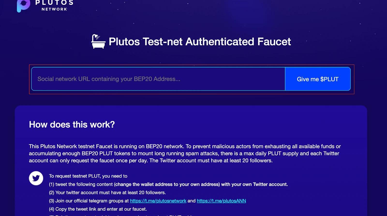 每名用户均可每天在水龙头页面领取1000个测试网代币。参与用户仅需拥有一个超过20位粉丝的推特账号即可参与。步骤-1:在推特上发布以下内容,并请在下列内容中替换成括号中内容为您自己的BEP20地址。—————————————-PlutosNetworkisexcitedtogiveaway10million$PLUTtokens.Everydayclaimfreetestnet$PLUT(redeemabletomainnetPLUT)viaourFaucet#Airdropathttps://staking.plutos.network/faucetSend1000PLUTtomywalletat(enteryourBEP20addresshere)#plutos#solana#bsc—————————————-步骤-2:推文发布后,复制该推文链接在指定位置。网址为:https://staking.plutos.network/faucet具体位置如下图所标:
