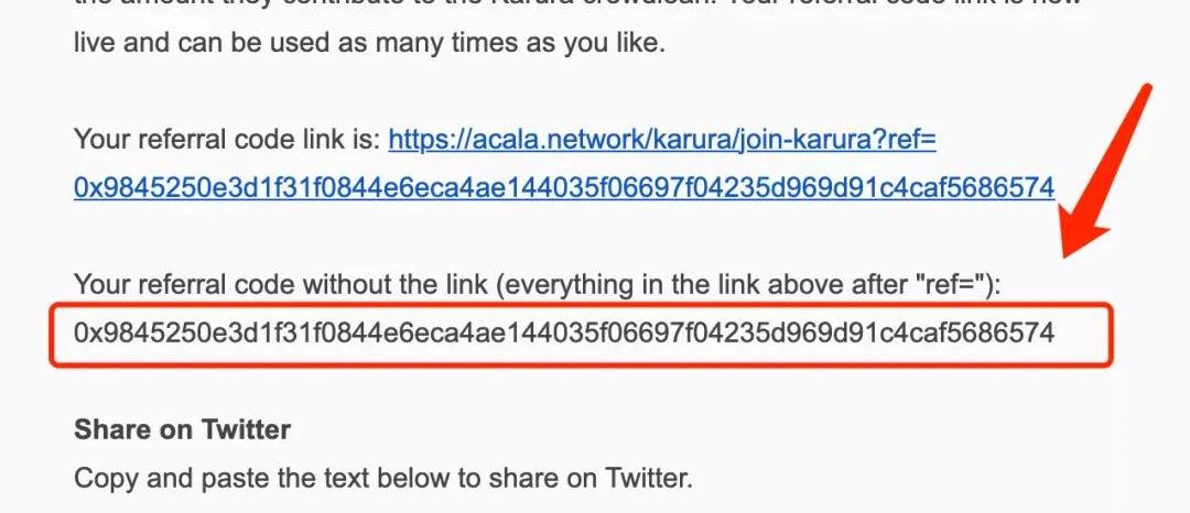 以下我们准备了两种在不同渠道的邀请引导语:1、Twitter、微信朋友圈、微博等期盼已久的平行链插槽竞拍终于要来了,快来加入KusamaDeFi中心——Karura的建设,帮助Karura获得首个平行链插槽!点击下方链接注册并参与,即可获得额外5%KAR参与奖励!邀请链接:xxxxxx2、微信群、电报、邮箱等Karura是Kusama生态一站式的DeFi中心,为用户带来了如去中心化交易所,借贷以及释放流动性产品等一系列开箱即用的DeFi产品。快来加入KusamaDeFi中心——Karura的建设,帮助Karura获得首个平行链插槽!点击下方链接注册并参与,即可获得额外5%KAR参与奖励!邀请链接:xxxxxx若你还有相关问题,请关注Acala公众号,添加小助手拉你进Acala中文讨论群。