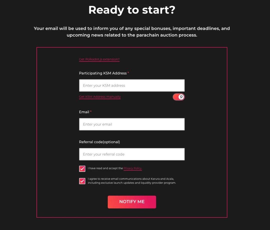 Karura众贷活动还有几天就要开始了,届时你将可以锁定你的KSM去帮助Karura在平行链竞拍中获胜。所有众贷支持者都将会在Karura上线后获得KAR奖励。如果你在之前的平行链竞拍预热活动中正确填写了你的KSM地址,请查看你当时所填写的通知邮箱,专属的推荐链接与推荐码已经发送至邮箱,这意味着你将会有资格获得额外的KAR推荐奖励。目前阶段仍处于预注册的活动,还未正式开始众贷与竞拍,但收到专属推荐链接与推荐码的你,可以开始提前向朋友分享,让朋友填写未来将要参与Karura众贷的KSM地址与邮箱。预注册注意事项