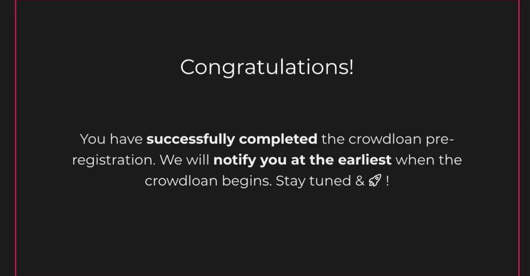 4、填写完毕后,出现以下页面,就意味着你所推荐的人已成功参与竞拍的预注册,当Karura众贷开始后,我们会在第一时间内通知大家!
