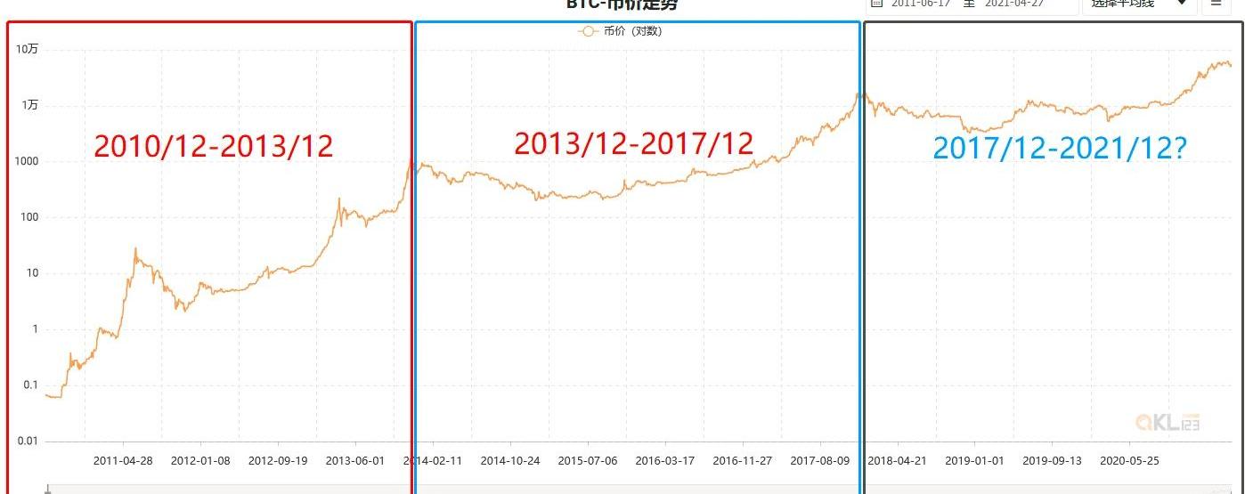 如果比特币周期论成立,那么本轮牛市就只剩下八个月左右的黄金期,之后将会进入新一轮熊市周期,那么,投资者在时间有限的前提下,该重点关注哪些领域?本次分享将会围绕这一话题展开。那么比特币周期论是否成立?我们来看历史数据。第一轮:2010年12月-2013年12月,比特币价格从0.2美元左右上涨至1127美元左右;第二轮:2013年12月-2017年12月,比特币价格从1127美元左右开始下跌,此后触底上涨至1.95万美元左右;第三轮:2017年12月-2021年12月?比特币价格从1.95万美元左右开始下跌,此后触底上涨至目前的55000美元左右;如下图所示: