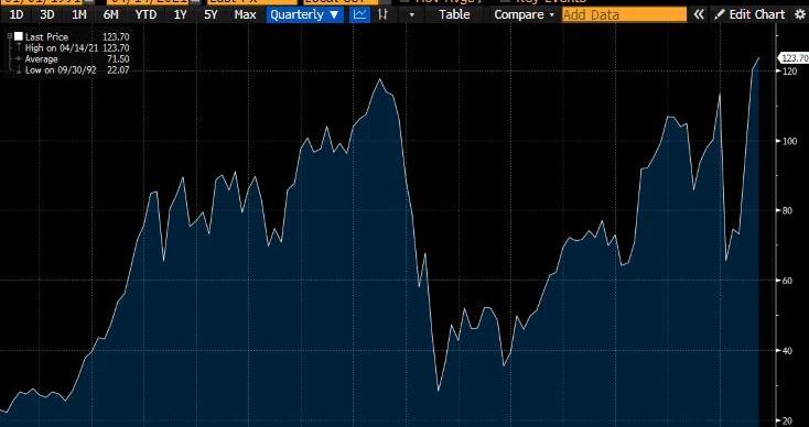 这是代表美国主要商业银行的KBW银行指数的走势图。如你所见,在2007年达到顶峰后,最近才超越了那个ATH。美联储为了拯救"大到不能倒"的银行不惜一切代价,这些银行还是用了14年的时间才夺回2007年的高点。