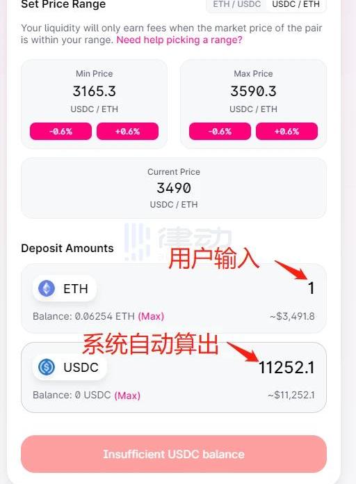 第三步:选择做市的价格区间这里我们要注意,V3版的系统并不支持LP在选择价格区间时输入任意价格。V3版本由于提供了流动性聚合功能,导致计算量较V2版本大为增加。所以为了尽量减少交易中的计算过程,降低交易者需要支付的gas费用,V3版本将原本可选的完整的价格范围,人为的切分成了不同的价格点。以0.3%费率的资金池为例,价格的最小变动单位以临近价格点的0.6%作为最小变动区间。如在3401.6USDC的价格点后,就是3422.1USDC)。不同费率的资金池会对应不同的最小变动比例。比如0.05%费率的资金池,价格的最小变动比例是0.1%,而1%费率的资金池,价格的最小变动比例是2%。但是这里用户不需要担心,我们只要在其中输入自己想要的价格,系统就会自动帮你将你输入的价格调整为最近的一个可选价格点。如果认为不满意,只需要点按下方的粉色按钮进行微调即可。我们在这里选择输入3165.3USDC与3590.3USDC,作为我们的做市范围。
