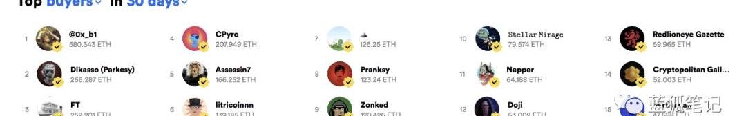 同时,加密艺术家的明星群体已经出现,排名TOP10的加密艺术家的创作作品会备受关注。随着市场的认可,其押注胜率会提升,当然也会导致其买入价格更高。最贵的加密艺术品NFT之收藏品市场