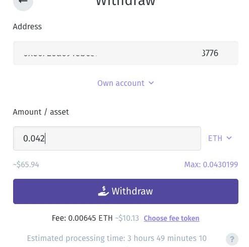 最后,就是提款环节了,顾名思义,就是将资金从二层网络转回一层网络,操作很简单,点击「-Withdraw」后会自动跳转界面,这时的地址是你当前链接的钱包地址,你也可以自由选择提至其他地址。