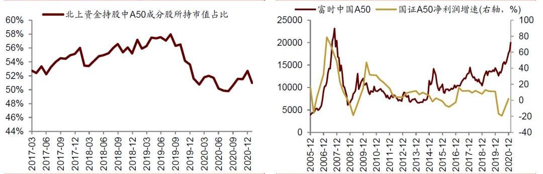 1、A50的定价原理A50通常是指富时中国A50指数期货的活跃合约价格,期货以富时中国A50指数作为基准指数,而富时中国A50指数是由全球四大指数公司之一的富时指数有限公司,为满足中国国内投资者以及合格境外机构投资者(QFII)需求所推出的实时可交易指数。富时中国A50指数是根据富时A股指数编制规则,从A股市场选择合格的最大50家公司组成的指数。其各项指标,包括业绩表现、流动性、波动性、行业分布和市场代表性均处于市场领先水平。该指数是以沪深两市按流通比例调整后市值最大的50家A股公司为样本。而富时中国A50指数期货,通常指新加坡交易所推出的富时中国A50指数期货,该期货一共有四个合约,分别是2个最近的连续月和两个季月。和所有期货类似,富时中国A50指数期货最终是以现金结算,最终结算价将是富时中国A50指数的官方收盘价,精确到两位小数点。因此,富时中国A50指数期货走势长期来看和富时中国A50指数走势一致,但是在到期日之前,富时中国A50指数期货可能会偏离富时中国A50指数,体现为基差的波动。对于A50指数期货定价来说,趋势上,主要由A50指数的表现来决定。2016年之前,外资对A50的影响较小,2016年之后,外资通过陆股通不断加仓A股,其中,A50指数成分股占比较高,因此,北上资金的流入流出对于A50指数短期走势开始产生越来越大的影响。但是,从中长期角度来看,A50指数表现取决于中国经济和A50指数成分股的盈利情况。