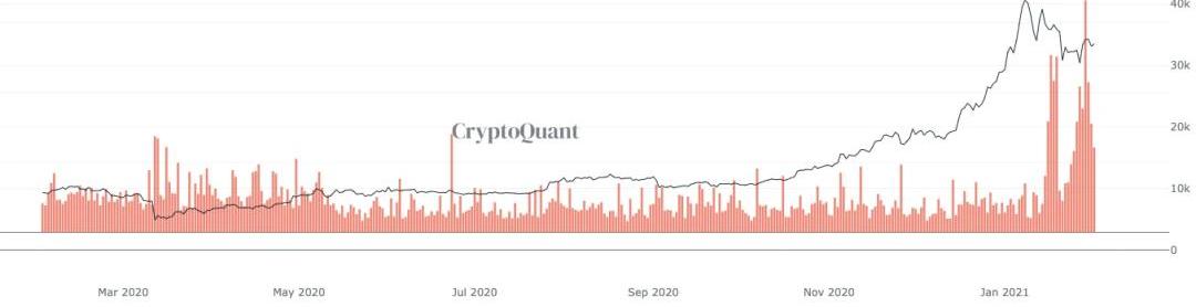数据来源:TradingView在所有人情绪到达顶峰的时候,久违的暴力调整突袭,自1月8日放量滞涨出现苗头后,比特币出现天量下跌,并数次跌破30000美元,调整已经接近一个月。其实在近期一路上涨的过程中,市场并不乏看空和做空的声音,但却被市场排山倒海般的狂热淹没,自2020年10月行情启动以来,比特币还未出现过接近30%跌幅的调整,人人都知道一场剧烈的调整迟早会到来,但是却不知道什么时候会到来。我们也认为比特币作为已经突破历史新高的资产品类,预测行情短期调整的拐点和时机属于天方夜谭,我们只需要去判断行情是否仍然处于长期上涨趋势的范围。从CryptoQuant的链上数据来看本次市场的调整矛头仍然是因为短期场内过高的做多杠杆率积累了脆弱性;其次我们从GlassNode链上数据观察到链上比特币获利比例接近历次牛市调整的高峰,情绪出现过热,获利盘过于丰厚,因此在卸杠杆的过程中出现了脆弱性的踩踏抛出;最后,在市场显示一定的承接力度后,又遇到了矿工群体的集中大量卖出,才让近期比特币走势显得异常沉重疲软。