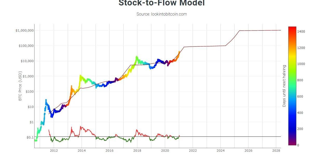 按照这个规律,本轮牛市BTC的第一个目标位,可以说就是100盎司黄金兑1个比特币。那么100盎司黄金等于多少钱呢?今天黄金的价格是将近1900美金一盎司。由于宽松的货币环境,未来2021年,黄金的价格还会增长,增长到多少取决于整体的宏观情况。据专业机构预测黄金价格可能达到2200美金或2300美金。假设到时黄金的价格是2200美金一盎司,100盎司黄金,就是22万美金换一个比特币。另外需要说明的是,比特币走到牛市结尾的时候,很可能会超过我们的预期价格。比如在2017、18年牛市中,比特币达到了十盎司黄金,换一个比特币之后。又迅速超越并达到,将近15盎司黄金,换一个比特币。在本轮牛市,如果比特币也超过我们的预期价格,比如从100盎司去到150盎司,那么比特币的最终价格,它久是一个我们所设想的区间。不能确定比特币一定达到多少,或者在多少停止,在这里,大家可以计算一下比特币的价格会是多少。除了比特币对黄金的估值模型,在币圈有一个认可度比较高的模型,叫stockstoflow。通过产出新的比特币和比特币现有的库存的关系,判断比特币未来的价格。stockstoflow模型除了预测比特币价格,还非常好的预测了黄金和白银贵金属的价格。