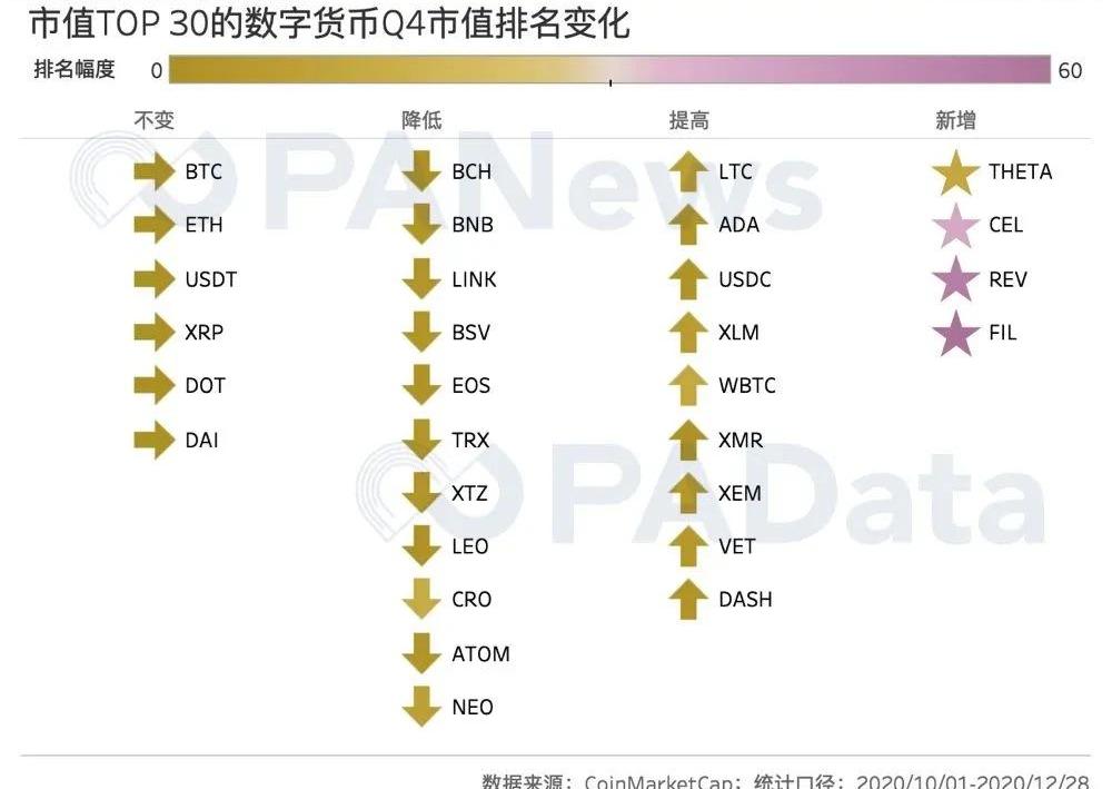 四季度,共有4种新资产首次进入市值TOP30,分别是流媒体区块链Theta的治理代币THETA、DeFi借贷平台Celsius的治理代币CEL、去中心化内容平台Revain的代币REV和分布式存储网络Filecoin的原生代币FIL。从资产轮动性上看,四季度略高于过往,这也是市场高度活跃的一个侧面印证。