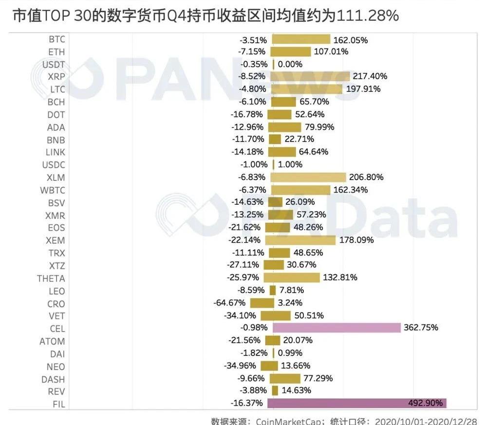 其中,BTC和ETH表现稳健,币价日均波动率分别约为4.58%和5.78%,低于平均波动水平,但相较三季度,BTC的波动率有所上升,ETH的波动率略微下调。除此之外,波动率较低的还有LEO、REV、WBTC和BNB,日均币价波动率都低于5.5%。相反,四季度币价日均波动率较大的数字货币包括FIL、XRP、VET和XEM,都超过了10%,其中FIL达到了15.34%。在强烈的单边上涨趋势中,TOP30数字货币的持币收益区间也在进一步扩大。持币收益区间是由季度内最低价和最高价较10月1日开盘价的收益组成的闭合区间。四季度持币收益区间的平均值达到了111.28%,较三季度的110.83%略微扩大,远高于上半年。