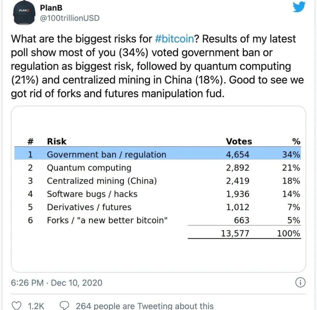 最近,一位受欢迎的加密分析师,也就是PlanB的《S2F—ForecastingModels》的作者,在他的读者中做了一个调查。主要问题是比特币可能面临的风险。