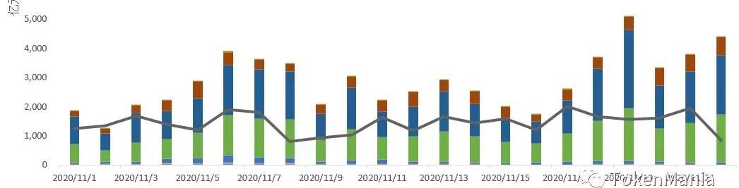 资料来源:非小号,TokenMania图4九大交易所历史每日总交易量变化