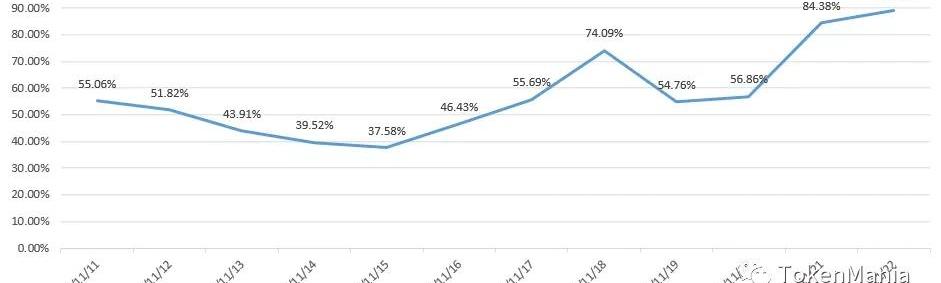 资料来源:同花顺,TokenMania各类资产中数字货币的市值波动性最强,在泡沫膨胀与泡沫破裂的过程中,数字货币价格更多地呈现出暴涨暴跌的趋势。2020年以来市场受全球疫情带来的流动性危机影响,比特币出现了大幅回调;近期市场上行回升至近年来高位,但长期来看数字货币处于相对估值低位,随着泡沫的挤出,数字货币值得作为另类资产进行部分配置。9.总结大盘走势:本周大盘放量突破站上新阶,市场交投情绪火热,投资者情绪维持极度贪婪,机构投资者加速布局。周初大盘自4750亿美元附近起步向上,在5000亿美元上下盘整数日后,周五始大盘进入加速通道,接连突破5300、5500亿美元关口,最高触及5678亿美元,尾盘高位小幅回调整理,收于5600亿美元附近,总市值日均值较上周上涨16.72%。外围市场方面,本周伴随新冠疫苗再度传出重磅利好,市场风险偏好有所回升,各类风险资产涨跌互现,黄金价格小幅下行,比特币收益一枝独秀。从盘面上看,本周比特币价格震荡上行,突破前高后继续向上突破,刷新近3年新高接近冲击历史高点,周日快速回调后迅速反弹,尾盘企稳18000美元上方;以太坊2.0存款合约地址余额已达成启动以太坊2.0创世区块的最低要求,受基本面利好消息和机构增持影响,以太坊需求高涨,一度突破620美元。从量能上看,比特币在经历了前期的震荡蓄能后,本次进攻极具攻击力,一举收复前期筹码失地刷新新高,市场成交量显著上升,投资者情绪向好,吸引更多外部流量关注,同时当前机构投资者加速入场,比特币合约市场量能继续放大,Bakkt比特币月度期货总交易额较前一周上涨逾73%,灰度比特币信托总持仓量已逾52.7万BTC。总体看,比特币18000美元附近存在较强的托底支撑力量,上行通道有望继续延伸,周日大幅回调后短期风险已得到一定程度释放,而后截至目前并无有效抛压威胁支撑位,在未跌破短期均线前,现货投资者可顺应趋势继续持有。此外,本周比特币期货再次出现短时间插针,当前比特币期货总体基差震幅增强,望投资者注意风险,降低杠杆倍数。交易所成交量:九大交易所日成交量均值上升48.70%。本周九大交易所一周累计总成交量为26705.94亿元人民币,较上周上升8745.96亿元,增幅为48.70%,从交易量结构来看,成交量占比前三名的交易所分别是Huobi计算,最近一周场外BTC交易量约2314.65万元。数字资产换手率:十大数字资产累计换手率上涨48.63%。本周十大数字资产换手率周累计461.28%,较上周上涨150.93%,涨幅48.63%;换手率最高为89.07%,最低为46.43%,极值差为42.64个百分点;其中ETC涨幅居首,本周较上周上涨41.62%。本周累计换手率排名前三位的分别是ETC为184.696亿美元。USDT溢价率:宽幅震荡,基本维持正溢价。本周USDT溢价率宽幅震荡,尾盘维持平价,kraken交易所usdt/usd交易对本周开盘溢价0.07%,最高溢价12.00%,最低溢价-0.01%,收盘溢价0.10%;伴随大盘持续冲高,近期USDT溢价率振幅增强,整体维持正溢价。比特币波动率指数:波动率指数冲高回落,市场情绪极度贪婪。本周比特币波动率指数震荡上升,较上周同期上升51.83%;开盘值2.22,最高值5.54,最低值1.81,收盘值2.90;恐惧&贪婪指数7日前为89点,本周最高为94点,最低为86点,恐惧&贪婪指数最新点位94点,较上周同期90点上升4点,伴随比特币价格继续冲高,市场情绪维持极度贪婪。期货合约:本周不同期限合约维持升水,市场量能继续放大,机构投资者加速入场。本周Bakkt比特币月度期货总交易额为3.19亿美元,较前一周上涨73%。从期限结构上来看,本周OKEX的当周合约平均下降0.97%,升水幅度下降891百分点;次周合约平均下降1.15%,升水幅度下降402.9个百分点;季度合约平均下降0.67%,升水幅度下降140.68个百分点;BitMEX永续合约平均贴水2.15%。本周OKEX的当周合约价格最新贴水2.52%,季度合约最新贴水2.97%;BitMEX永续合约最新贴水。本周远期合约价格加速上行,市场维持贪婪情绪,建议期货投资者注意风险严控仓位,优选平台,防范插针回调和平台宕机等原因导致的爆仓。宏观视角:本周新冠疫苗再度传出重磅利好,市场风险偏好回升,各类风险资产涨跌互现,原油价格大幅拉升,比特币涨幅一枝独秀。美股方面,周初受新冠疫苗进展利好影响欧美股市再度集体大涨,而后价格回落,本周纳指周涨0.22%,报11854.97点;道指周涨-0.73%,报29263.48点;标普500指数周涨-0.77%,报3557.54点;COMEX黄金期货周涨-0.73%,报1869.50美元/盎司,连跌两周;布伦特原油周涨5.89%,报45.14美元/桶;NYMEX原油期货周涨5.83%,连涨三周;国内股市方面,本周题材股回暖,上证指数周涨2.04%,报3377.73点;深证成指周涨0.71%,报13852.42点;创业板指周涨-1.47%,报2667.09点。风险提示价格回调风险国内外监管政策超预期国际地缘环境变化超预期疫情进一步扩散风险比特币合约价格波动免责声明TAMC研究院与本报告中所涉及的数字资产或其他第三方不存在任何影响报告客观性、独立性、公正性的关联关系。本报告所引用的资料及数据均来自合规渠道,资料及数据的出处皆被TAMC研究院认为可靠,且已对其真实性、准确性及完整性进行了必要的核查,但TAMC研究院不对其真实性、准确性或完整性做出任何保证。报告的内容仅供参考,报告中的事实和观点不构成相关数字资产的任何投资建议。TAMC研究院不对因使用本报告内容而导致的损失承担任何责任,除非法律法规有明确规定。读者不应仅依据本报告作出投资决策,也不应依据本报告丧失独立判