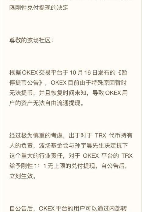 大致OKEX也没有想到孙哥变成了现在这个孙哥,但随后孙哥的动作让OK意识到,孙哥还是那个孙哥。晚上十二点左右,孙宇晨发了一条微博,提出波场和孙宇晨决定抗下这个重大的行业责任,对OKEX平台的TRX给予刚性1:1兑付体现,将OKEX上的币以TRX的形式打到孙宇晨指定的一个账户上。