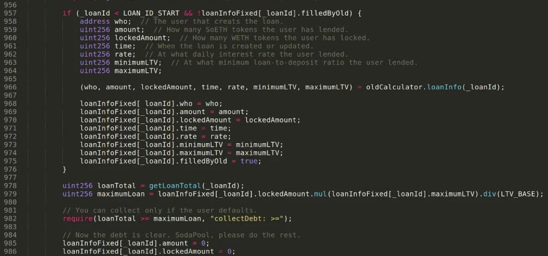 https://github.com/该等式的代码实现与soda项目中的逻辑设计相符,该等式的真假与用户的借贷债务数目和被锁本金数目相关。漏洞完成修复。soda项目中关于该等式的逻辑设计细节可以从下面的链接中进行了解:https://medium.com/soda-finance/the-soda-revolution-9185fdb99fc1事件分析总结