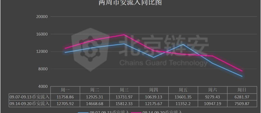 过去一周,在上半周比特币价格有一小波向上走势,也让链上数据相对活跃,但是很快币价再度进入盘整波动,链上活跃度也随机下降。币安交易所BTC流向数据流入:09.07-09.13:78218.0209.14-09.20:85171.86较之前一周上涨:8.89%详细数据图如下: