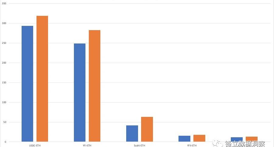 差距更大的项目TOP5平均注入资金池的ETH数量。USDC-ETH资金池TOP5平均注入ETH达到了惊人的31320ETH,因此撑起了整个资金池的体量。YFI-ETH的TOP5平均注入ETH达到了16627ETH。YFII-ETH的资金池TOP5平均注入ETH仅为139。另外可以看到TOP5用户平均注入资金池的ETH远大于TOP100用户平均ETH,更远大于所有用户平均ETH。验证了Uniswap创始人Adams的那句话“Justwhalesplayingwhalegames.”散户所占挖矿收益少之又少,扣除链上手续费,收益比远低于头部用户。
