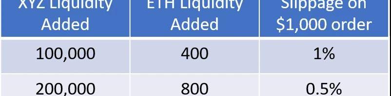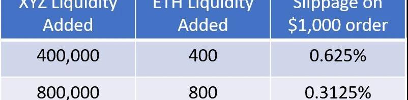让我们看一下项目团队当前是如何建立流动性。示例场景:一个团队创建了代币XYZ,他们认为代币的初始公平市场价格应为1美元,而此时以太坊价格为250美元。下表是XYZ和ETH资产进入一个恒定50/50AMM的成本和滑点表: