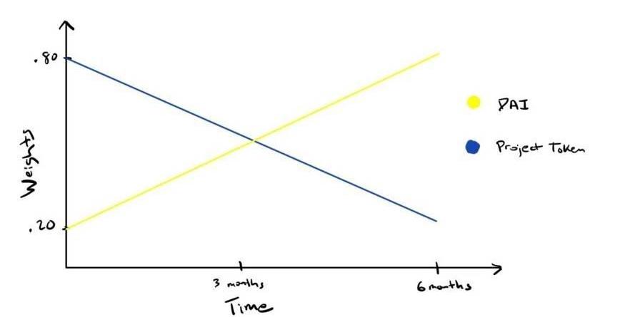 LBP池权重的指数示例使用指数曲线的主要优点之一是压制token释放时最初的炒作和市场的狂热。通过快速调整权重,从而降低池中代币的价值,阻止由于早期投机而导致价格最终的飙升。本文用项目token和Dai来列举例子。智能池模板可以实现token数组与权重的动态变化。因此,可以采取这样的一种设置:以80%XYZ,10%DAI,10%ETH开始,以33%XYZ,33%DAI,33%ETH结束。允许用户用ETH或DAI购买项目token。