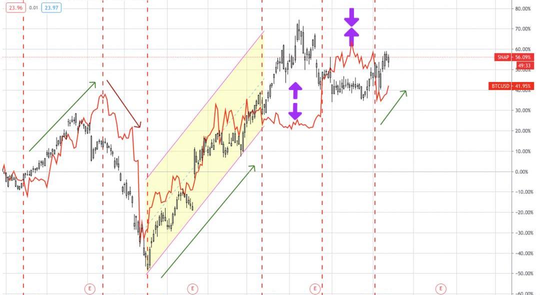 BTC/USD是否意味着要将BTC视同为科技股?在纳斯达克指数由大量科技股组成的情况下,我们是否应该将BTC视为一种科技股呢?下面,是BTC与SNAP(Snapchat)的对比图。我们可以看到,除去反转期,它们的表现都非常相似(如箭头所示)。SNAP和BTC的回报率也非常相似,自今年年初以来,BTC(红线)的表现仅略微超过SNAP。SNAP/BTC