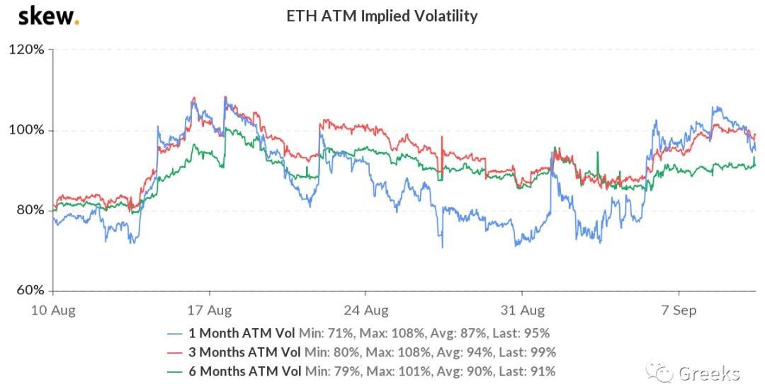 BTC历史波动率10d82%30d57%90d49%1Y81%期权持仓量13亿美元,期权成交量0.49亿美元,今天随着DeFi带动ETH反弹,比特币也止跌回升。各标准化期限隐含波动率:今日:1m65%,3m75%,6m76%9/9:1m69%,3m77%,6m75%比特币今天的日波动再度下降,止跌没有再跌到10000美元以下。短期隐波下降,月底IV将将在60%之上。
