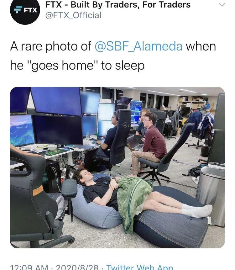 前几天推特上有一张图特别能说明现在币圈从业者的状态,加密衍生品交易所FTX发推特表示,创始人SamBankman-Fried下班回家睡觉就是在办公室打地铺。